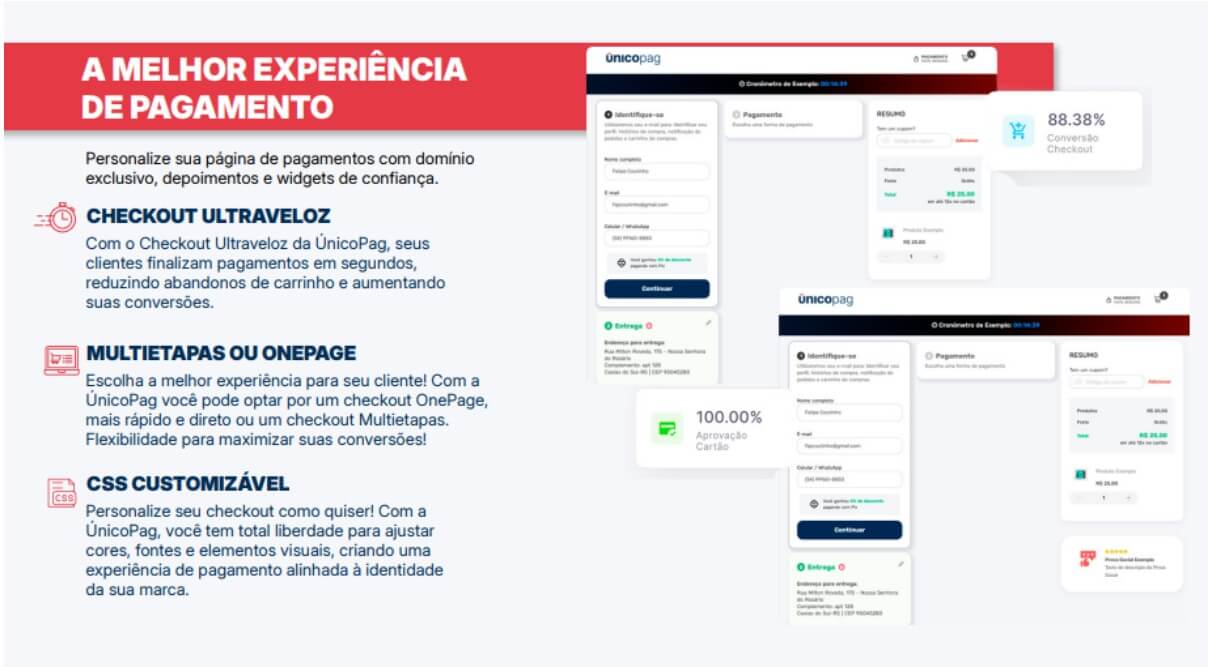 O checkout da UnicoPag foi desenvolvido para oferecer a melhor experiência de pagamento possível, combinando velocidade, personalização e confiança.