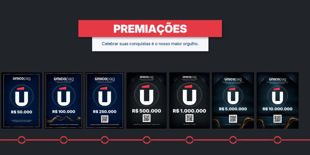 A UnicoPag reconhece o crescimento real dos lojistas por meio de premiações de faturamento, simbolizadas por placas comemorativas que representam marcos alcançados dentro da plataforma.